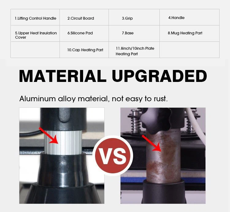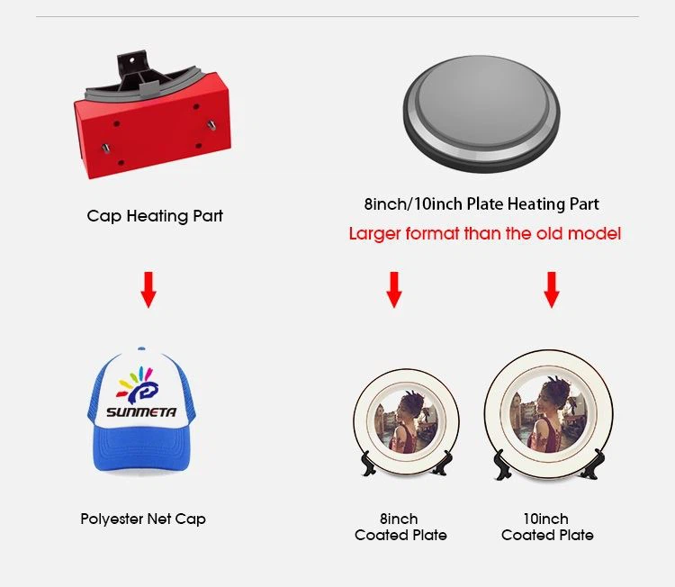 5 in 1 digital heat press machine has the flate printing area is 29*38cm (12*15") heat press machine,1pcs 11oz mug heating elements ,1pcs cap heating ,1pcs 8 inch and 10inch plate heating pad ; The 5 in 1 heat press machine for t shirts, mugs, hats, caps, plates, bags and pads, etc. It can easily transfer colorful pictures and characters onto ceramics and textiles such as cotton, fabric, etc.