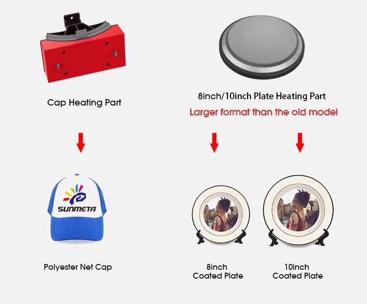 Heat press for shirts and hats come with accessories part :9oz/11oz/12oz/bottle heating pad,8’/10’ plate heating pad; cap heating pad.