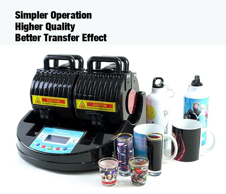 Cup heat press machine, which can print 11oz mug, 9oz mug, wine glass, aluminum bottle, it greatly save the production cost and reduce the production process. Comes with the machine, have 11oz silicon clamp, 9oz silicon clamp, tall wine glass clamp and short wine glass clamp. Just change the clamp, you can do different products. Silicone mug clamps, small size, light weight, easy to carry. Low price, silicon material, not easily damaged.