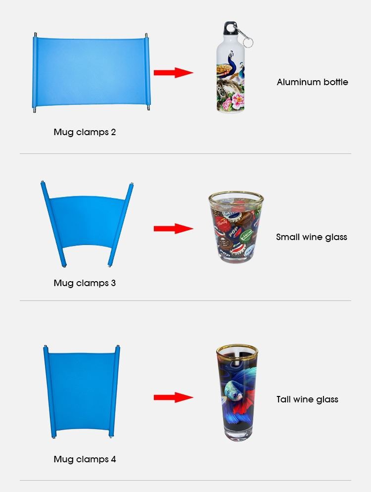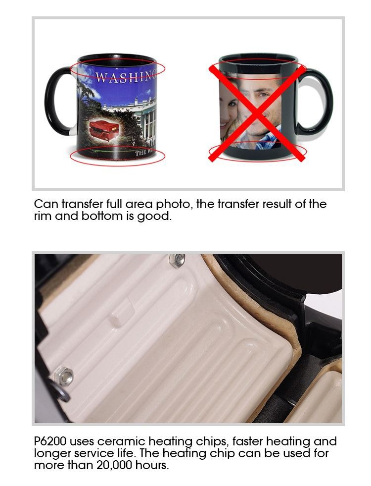 Mug transfers ceramic heating pad heats up quickly, and service life achieve 20,000 hours, the clamp covered mug tight and good transfer effect. Mug press machine transfer large areas. And clamp cost cheaper than mug heater
